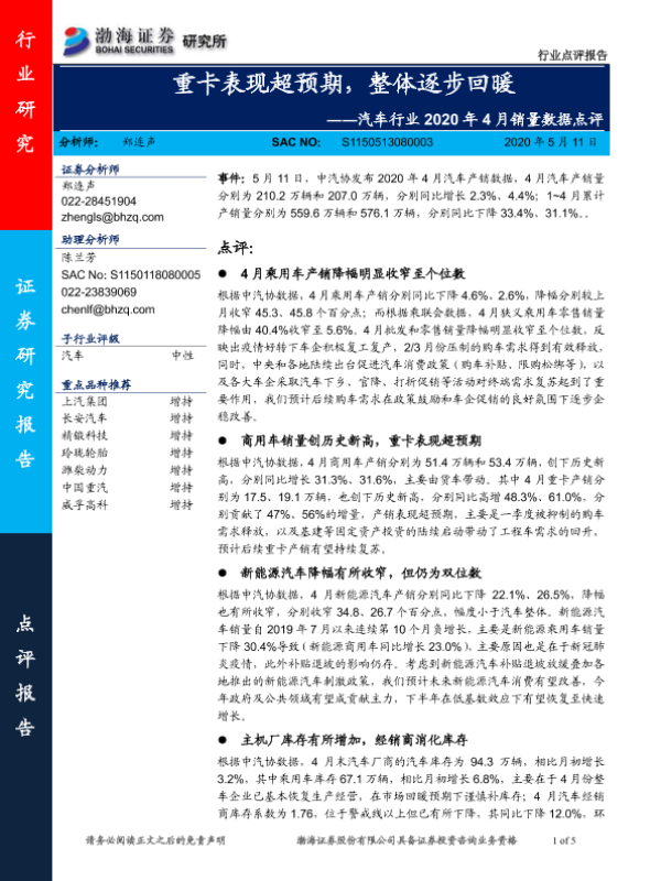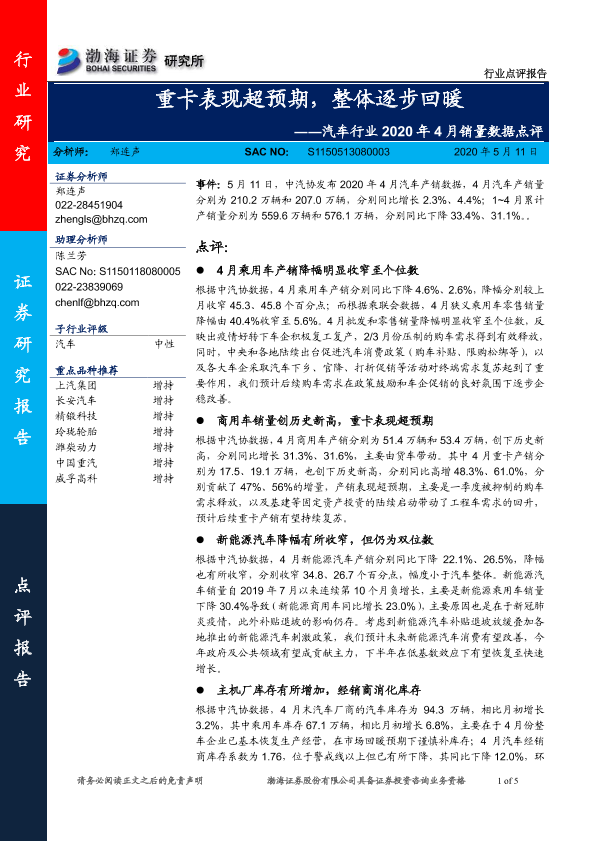 【渤海证券】【20200511】汽车行业2020年4月销量数据点评:重卡表现超预期,整体逐步回暖-5页