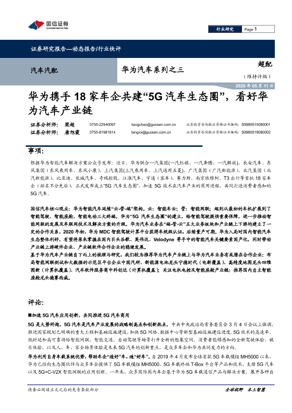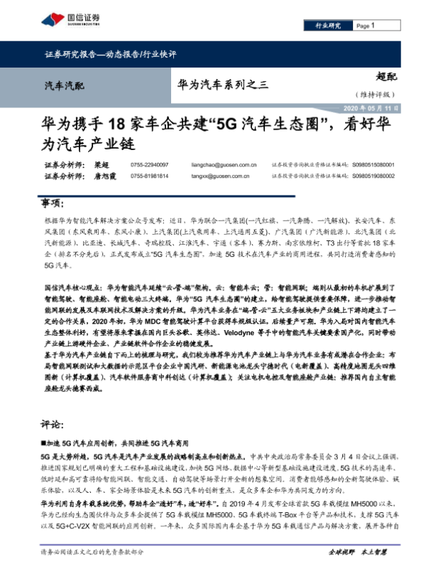 【国信证券】【20200511】华为汽车系列之三:华为携手18家车企共建“5G汽车生态圈”,看好华为汽车产业链-11页