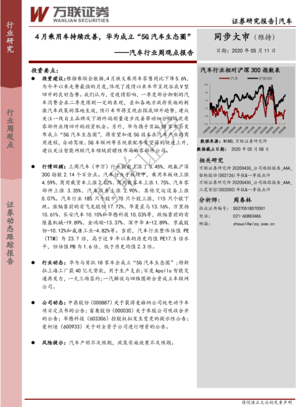 【万联证券】【20200511】20200511-万联证券-汽车行业周观点报告:4月乘用车持续改善,华为成立“5G汽车生态圈”-13页