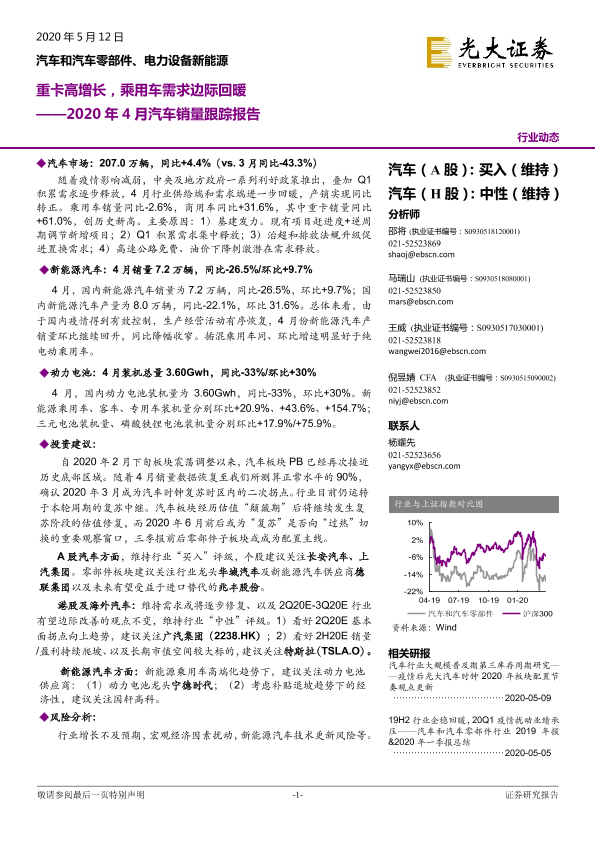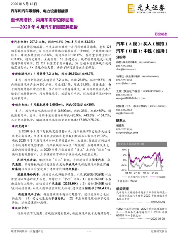 【光大证券】【20200512】2020年4月汽车销量跟踪报告:重卡高增长,乘用车需求边际回暖-16页