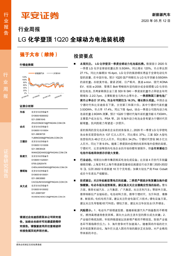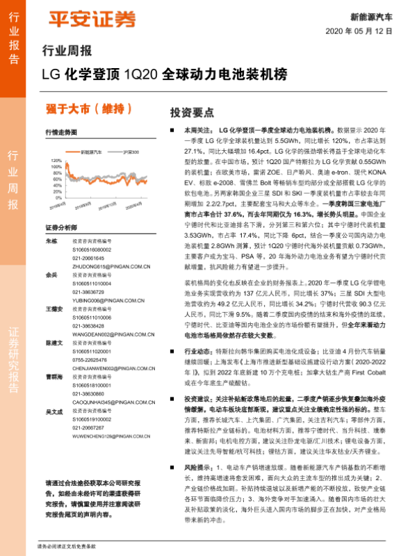 【平安证券】【20200512】20200512-平安证券-新能源汽车行业周报:LG化学登顶 1Q20全球动力电池装机榜-9页
