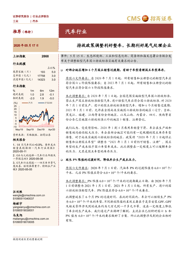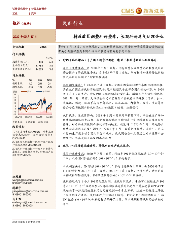 【海通证券】【20200517】汽车行业:排放政策调整利好整车,长期利好尾气处理企业-3页