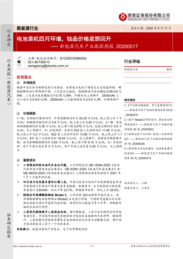 【浙商证券】【20200517】20200517-浙商证券-新能源汽车产业跟踪周报:电池装机四月环增,钴品价格底部回升-7页