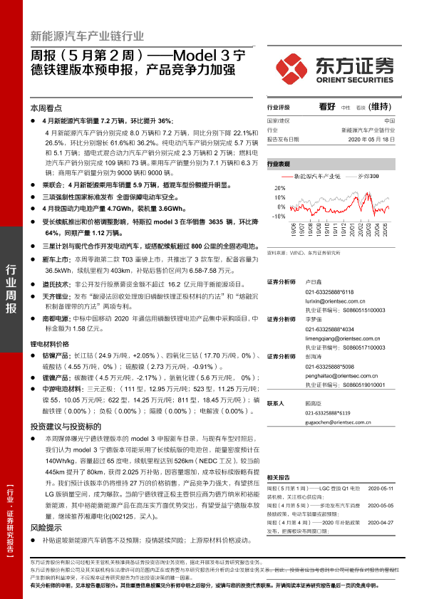 【东方证券】【20200518】20200518-东方证券-新能源汽车产业链行业周报(5月第2周):Model 3宁德铁锂版本预申报,产品竞争力加强-25页