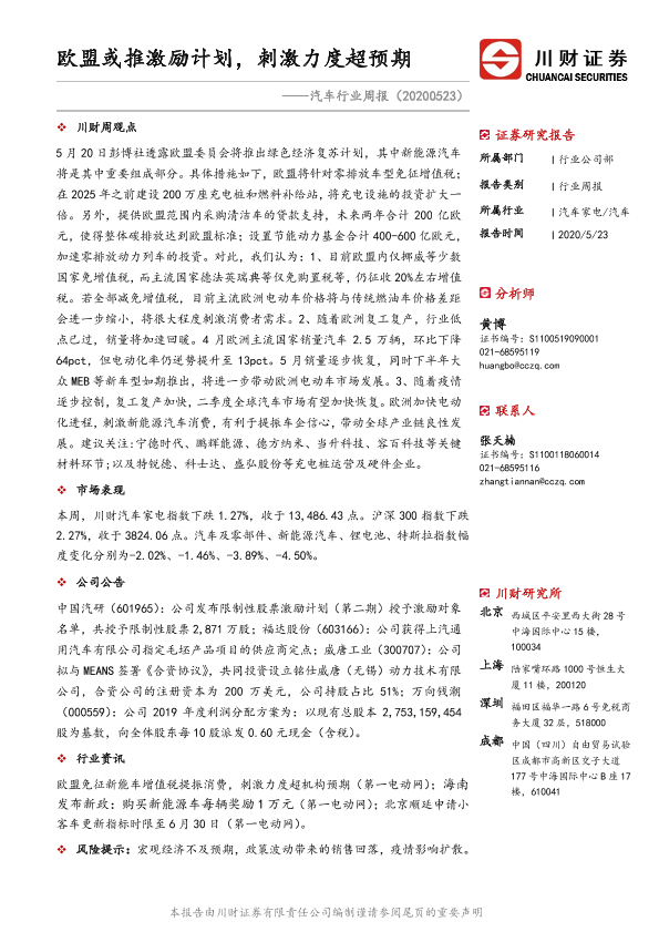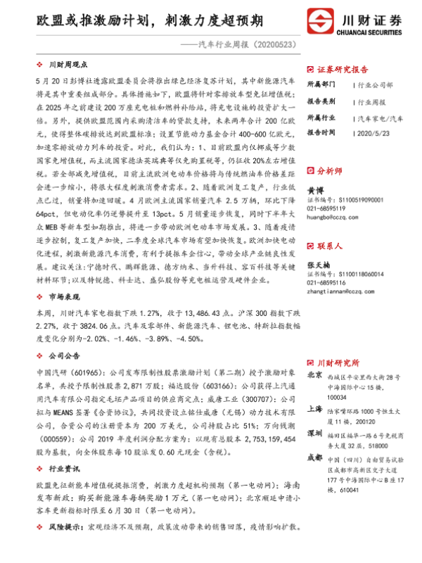 【川财证券】【20200523】汽车行业周报:欧盟或推激励计划,刺激力度超预期-9页