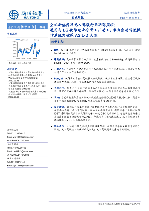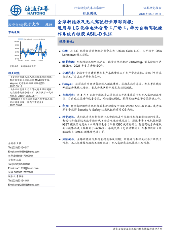 【海通证券】【20200525】全球新能源及无人驾驶行业跟踪周报:通用与LG化学电池合资工厂动工,华为自动驾驶操作系统内核获ASIL-D认证-5页