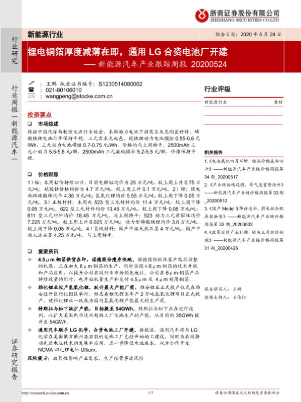 【浙商证券】【20200524】20200524-浙商证券-新能源汽车产业跟踪周报:锂电铜箔厚度减薄在即,通用LG合资电池厂开建-7页