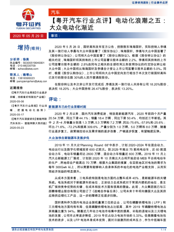 【粤开证券】【20200529】电动化浪潮之五:大众电动化渐近-4页