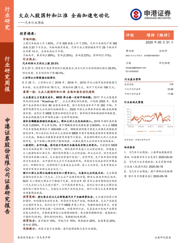 【申港证券】【20200531】20200601-申港证券-汽车行业周报:大众入股国轩和江淮 全面加速电动化-27页
