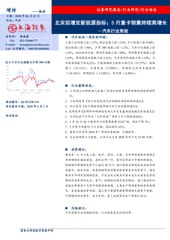 【上海证券】【20200603】20200603-上海证券-汽车行业周报:北京拟增发新能源指标;5月重卡销量持续高增长-9页