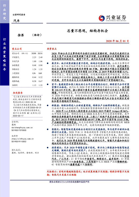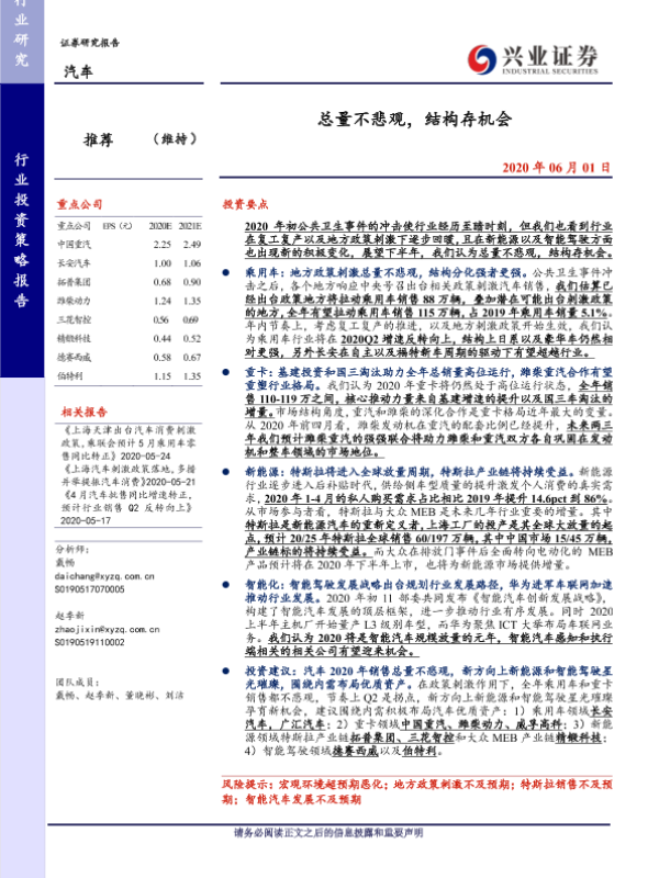 【兴业证券】【20200601】20200601-兴业证券-汽车行业投资策略报告:总量不悲观,结构有机会-68页
