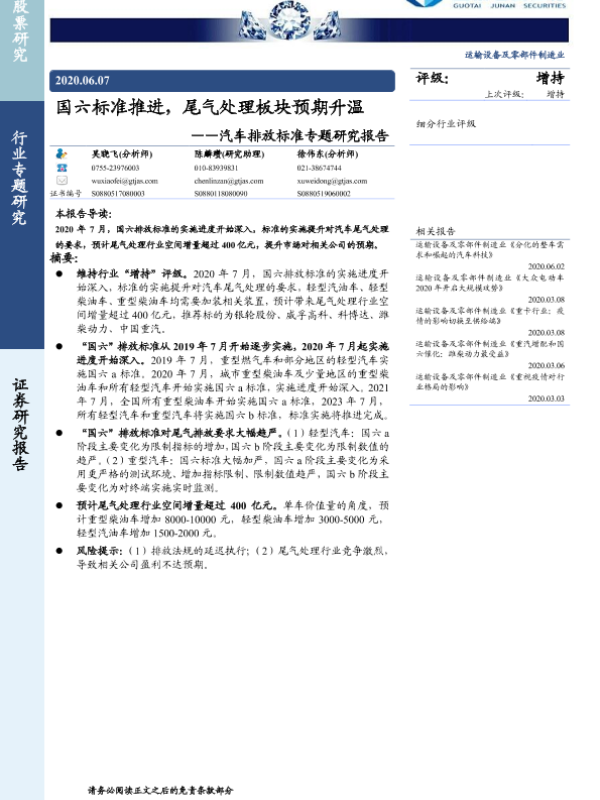 【国泰君安证券】【20200607】国六标准推进,尾气处理板块预期升温——汽车排放标准专题研究报告-10页