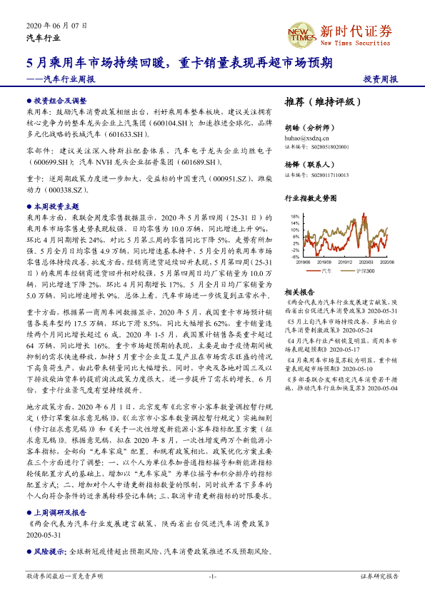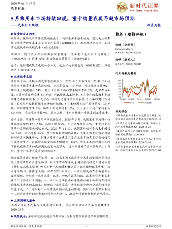 【新时代证券】【20200607】20200607-新时代证券-汽车行业周报:5月乘用车市场持续回暖,重卡销量表现再超市场预期-20页