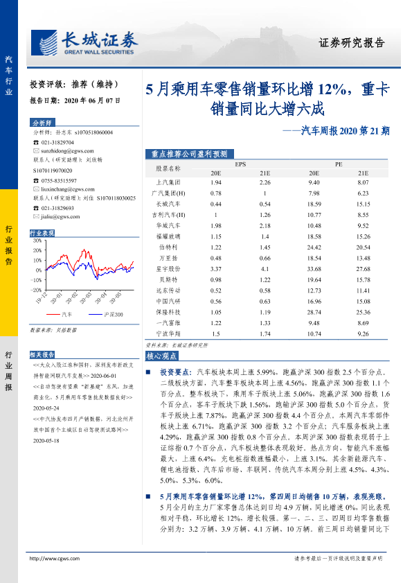 【长城证券】【20200607】汽车周报2020第21期:5月乘用车零售销量环比增12%,重卡销量同比大增六成-13页