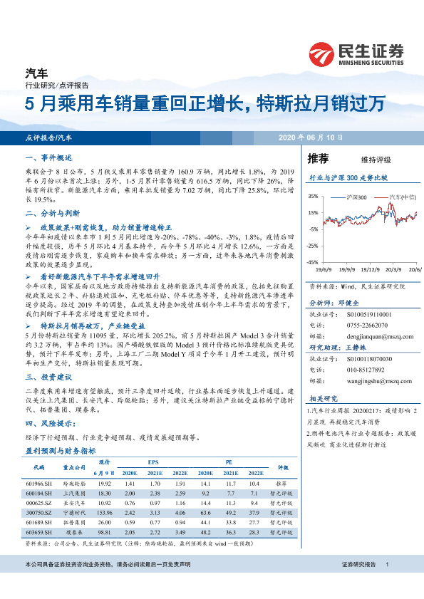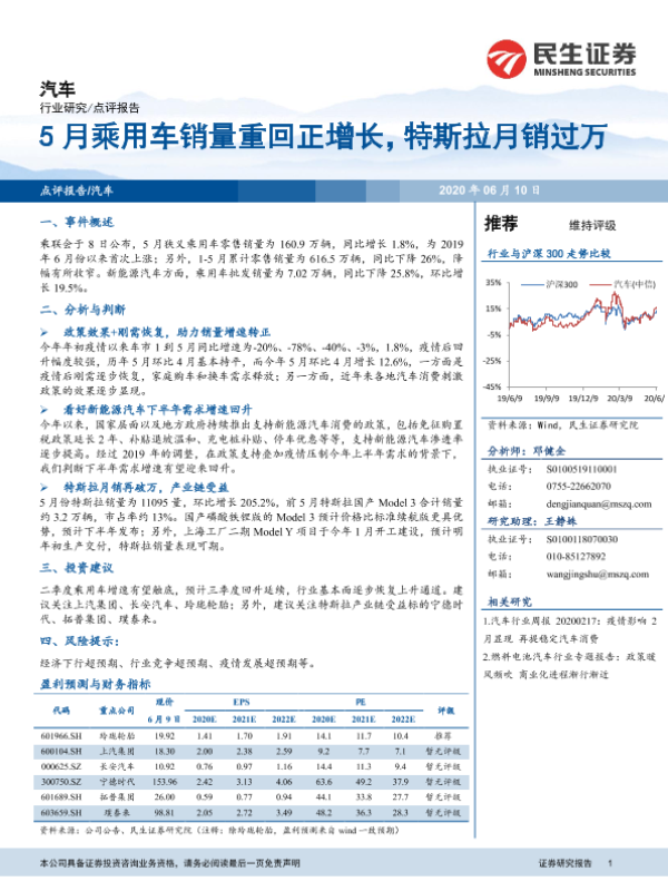 【民生证券】【20200610】汽车:5月乘用车销量重回正增长,特斯拉月销过万-3页