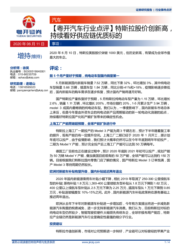 【粤开证券】【20200611】特斯拉股价创新高,持续看好供应链优质标的-4页