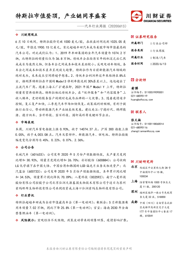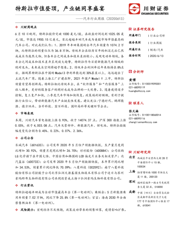 【川财证券】【20200613】20200613-川财证券-汽车行业周报:特斯拉市值登顶,产业链同享盛宴-10页