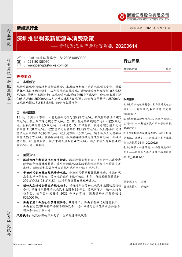 【浙商证券】【20200614】20200614-浙商证券-新能源汽车产业跟踪周报:深圳推出刺激新能源车消费政策-7页