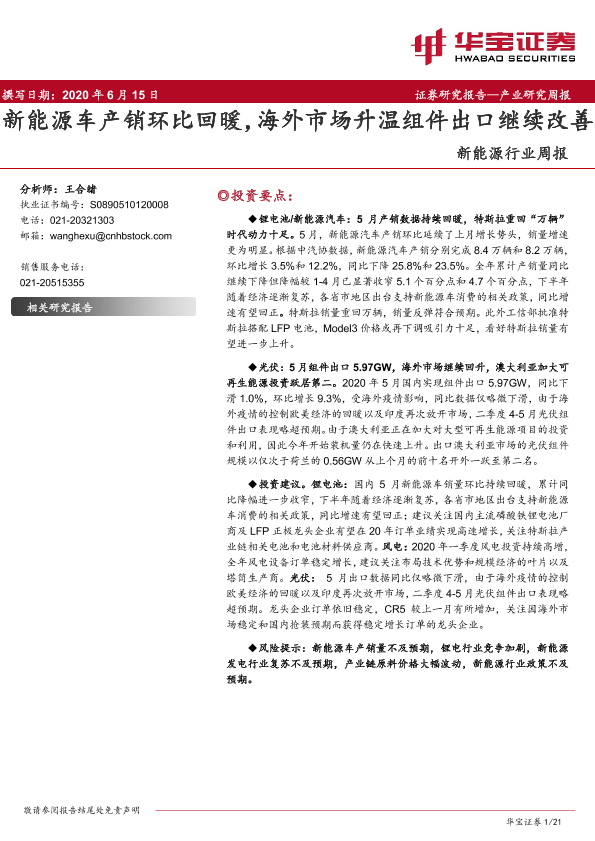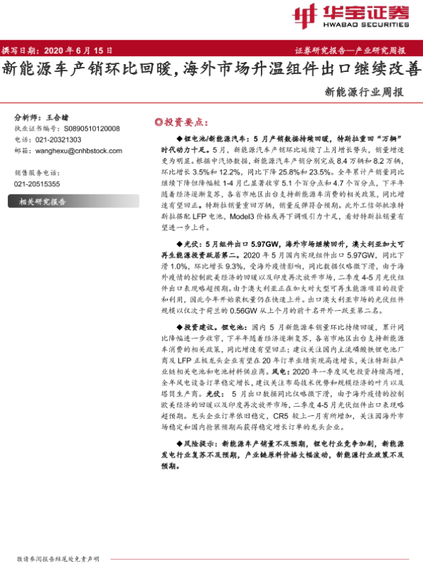 【华宝证券】【20200615】20200615-华宝证券-新能源行业周报:新能源车产销环比回暖,海外市场升温组件出口继续改善-21页
