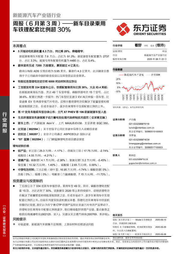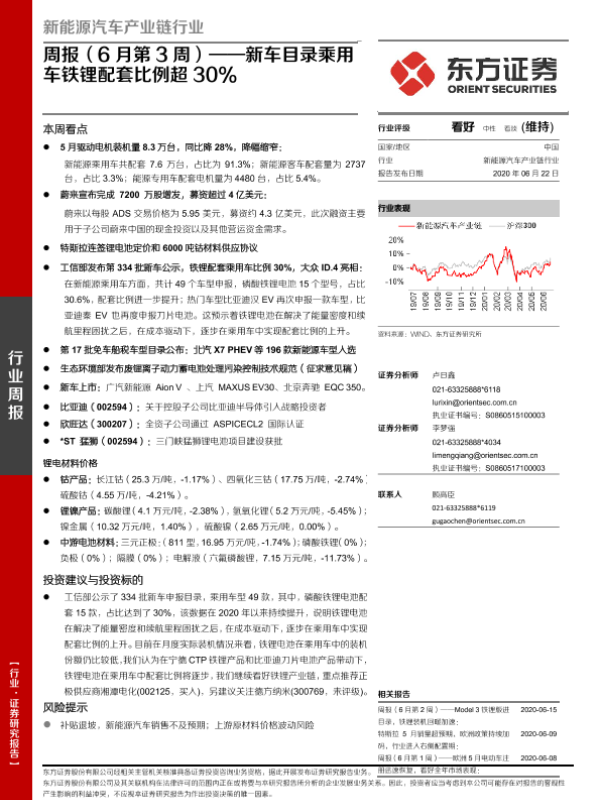 【东方证券】【20200622】新能源汽车产业链行业周报(6月第3周):新车目录乘用车铁锂配套比例超30%-24页