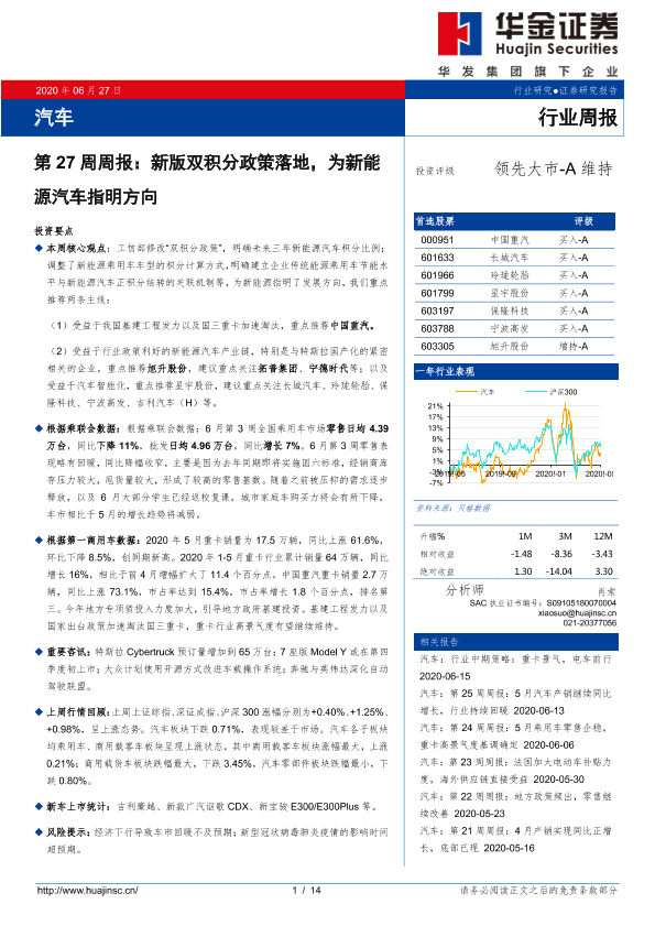【华金证券】【20200627】汽车第27周周报:新版双积分政策落地,为新能源汽车指明方向-14页