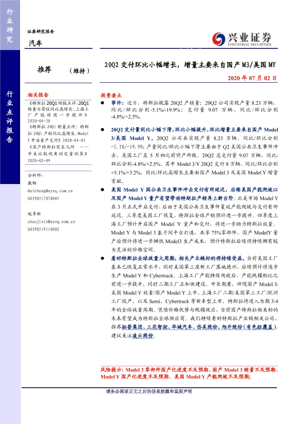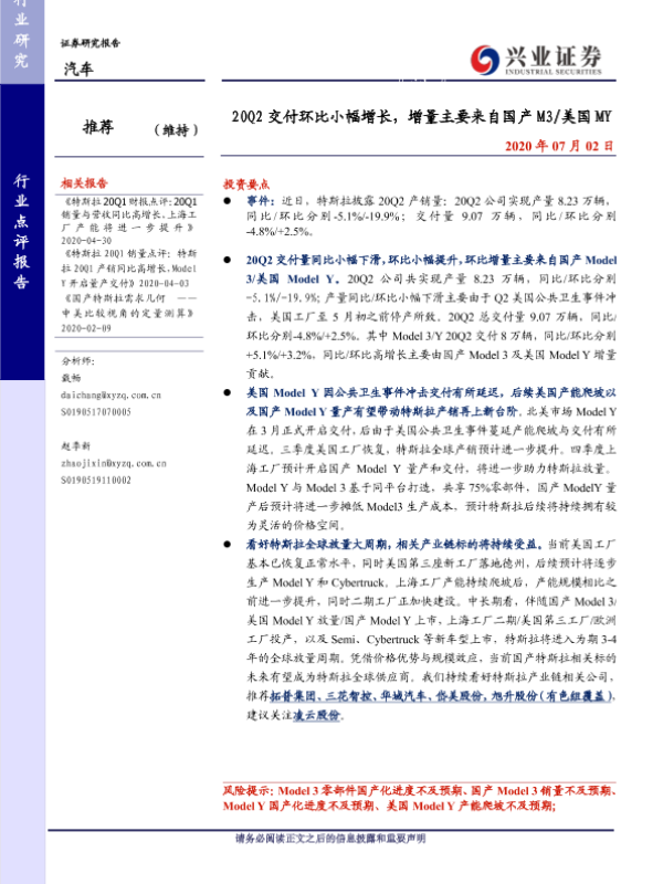 【兴业证券】【20200702】20Q2交付环比小幅增长,增量主要来自国产 M3/美国 MY-4页