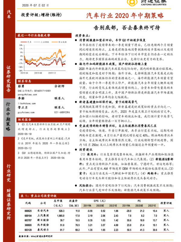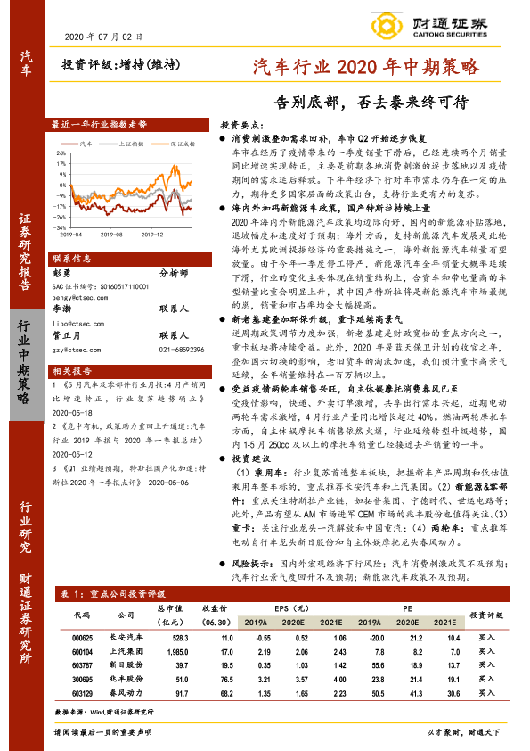 【财通证券】【20200702】汽车行业2020年中期策略:告别底部,否去泰来终可待-27页