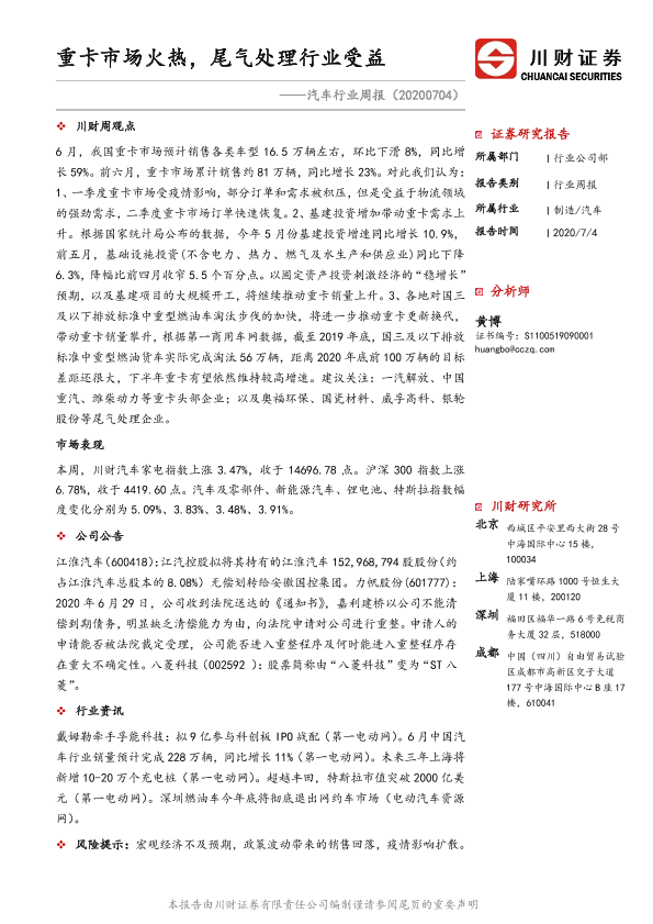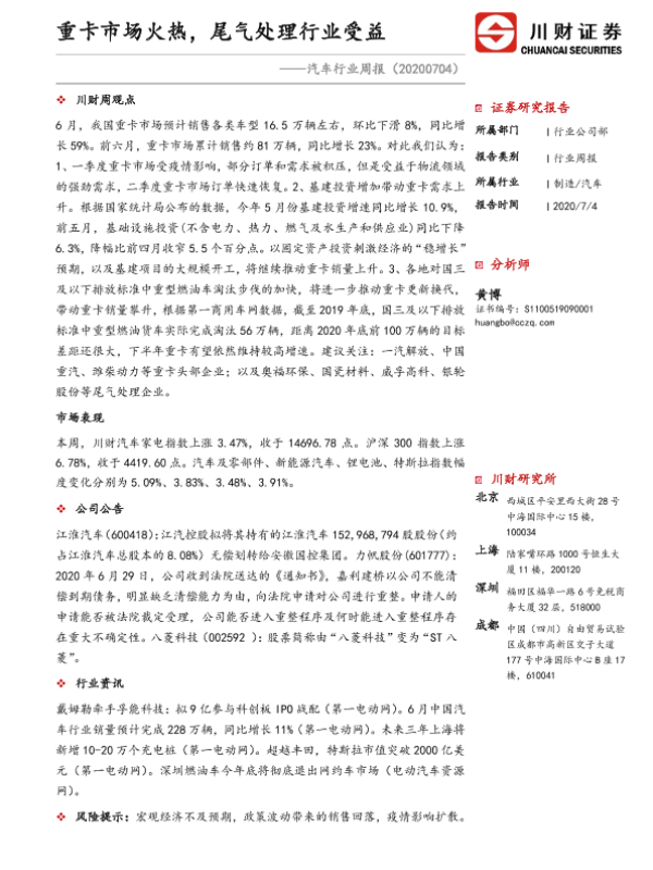 【川财证券】【20200704】20200704-川财证券-汽车行业周报:重卡市场火热,尾气处理行业受益-10页