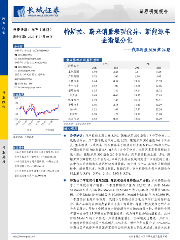 【长城证券】【20200705】汽车周报2020第24期:特斯拉、蔚来销量表现优异,新能源车企渐显分化-14页