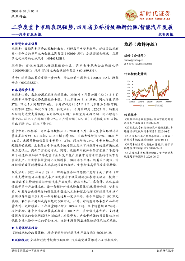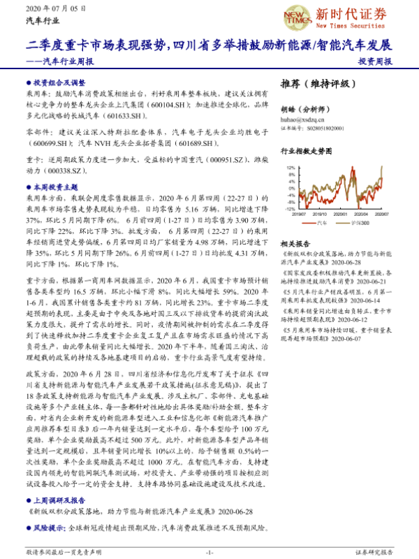 【新时代证券】【20200705】20200705-新时代证券-汽车行业周报:二季度重卡市场表现强势,四川省多举措鼓励新能源/智能汽车发展-20页