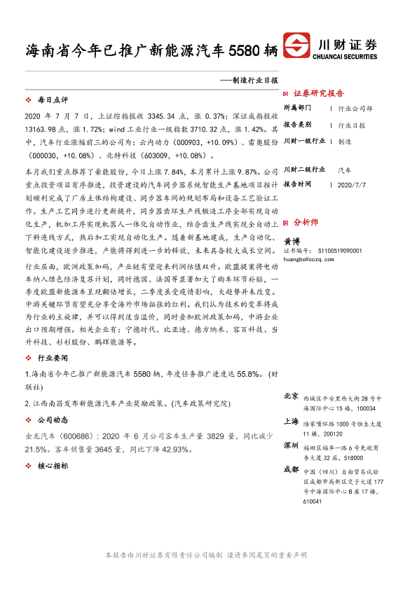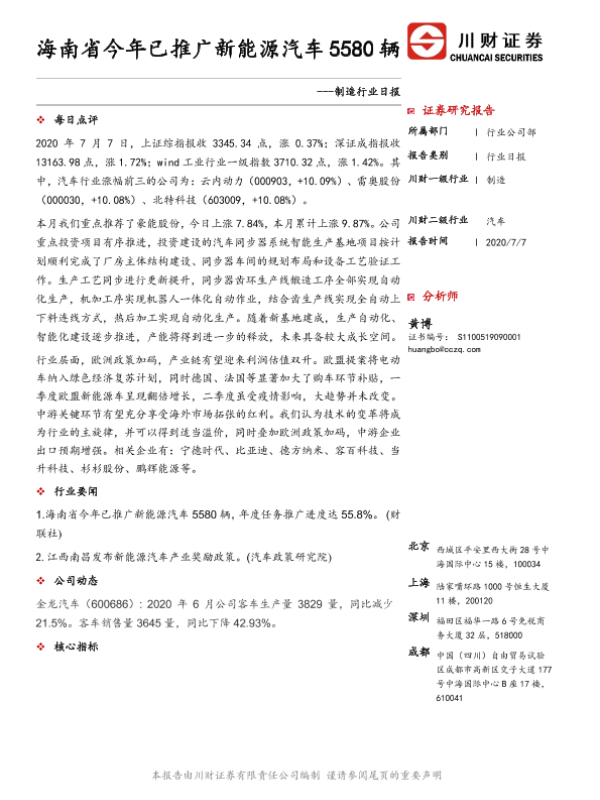 【川财证券】【20200707】制造行业日报:海南省今年已推广新能源汽车5580辆-4页