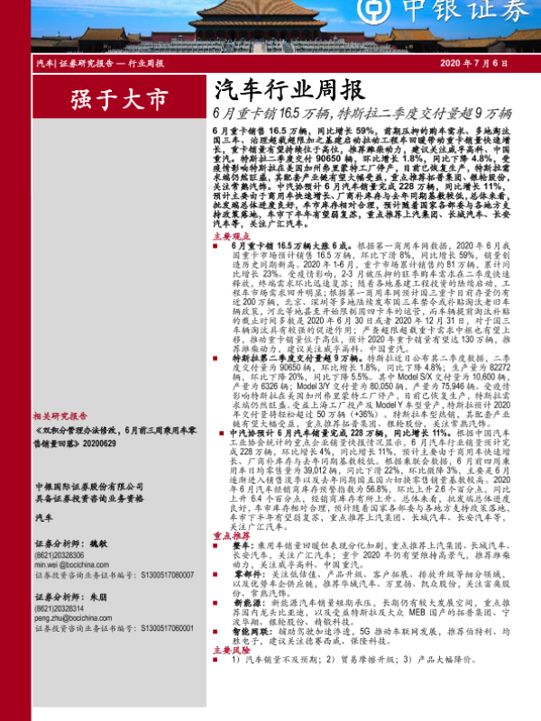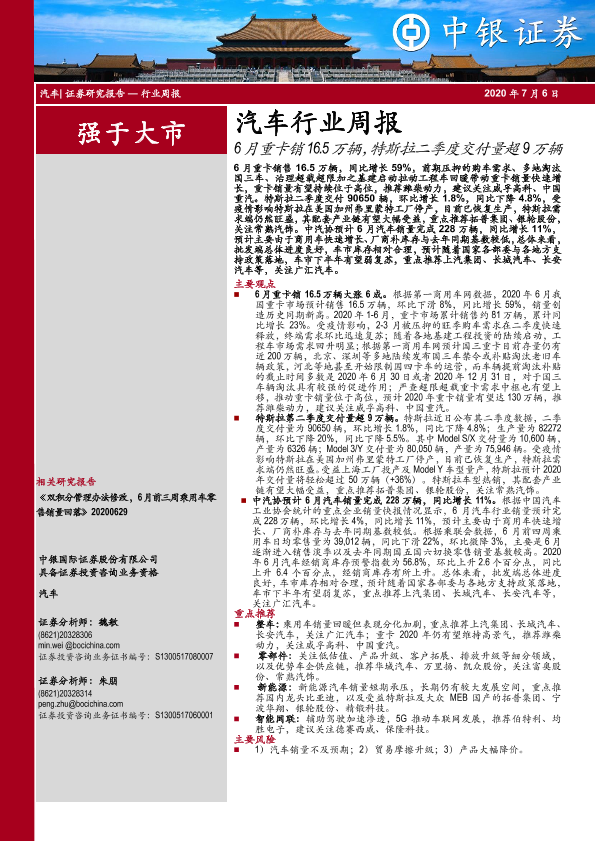 【中银证券】【20200706】20200706-中银证券-汽车行业周报:6月重卡销16.5万辆,特斯拉二季度交付量超9万辆-16页