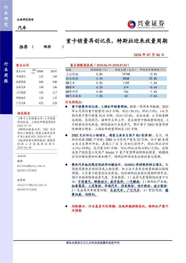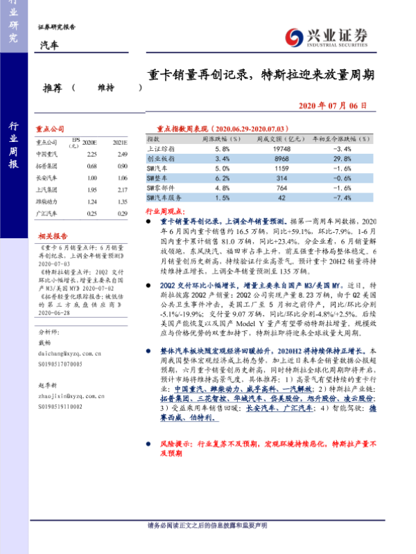 【兴业证券】【20200706】20200706-兴业证券-汽车行业周报:重卡销量再创记录,特斯拉迎来放量周期-19页