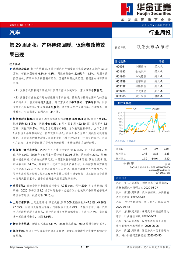 【华金证券】【20200711】汽车第29周周报:产销持续回暖,促消费政策效果已现-12页