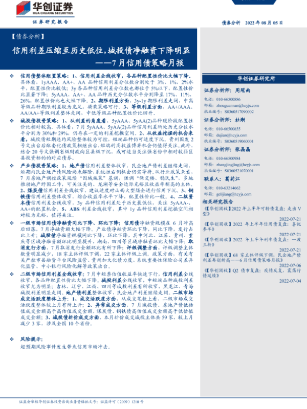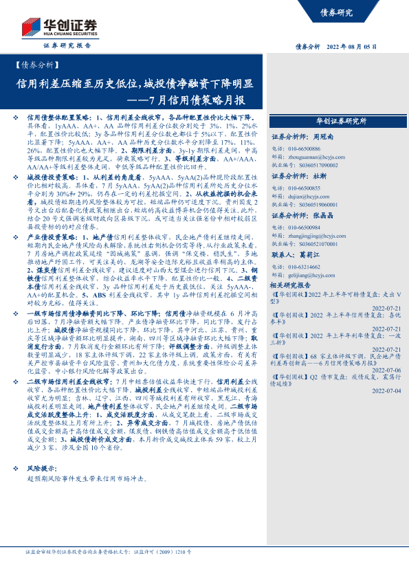 【华创证券】【20220805】7月信用债策略月报:信用利差压缩至历史低位,城投债净融资下降明显-26页