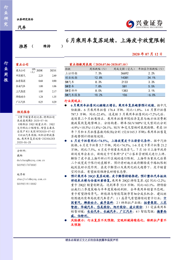 【兴业证券】【20200712】6月乘用车复苏延续,上海皮卡放宽限制-19页
