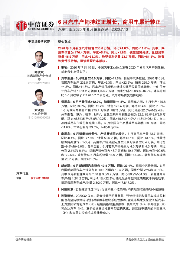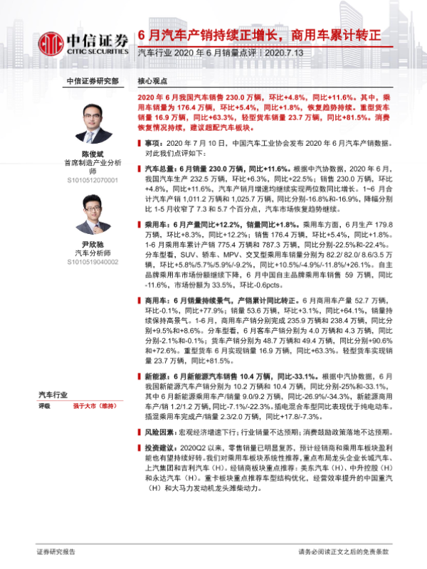 【中信证券】【20200713】2020年6月销量点评:6月汽车产销持续正增长,商用车累计转正-3页