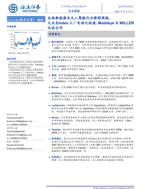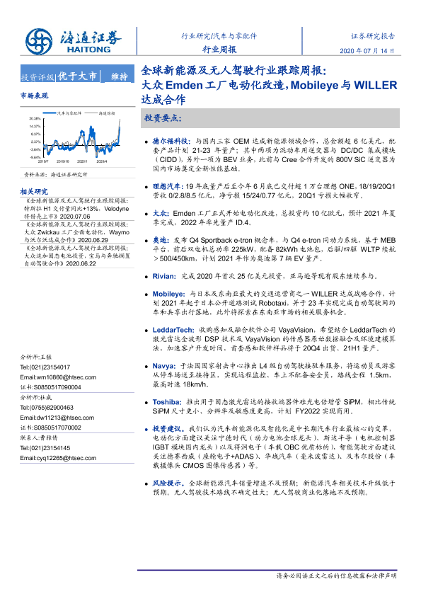 【海通证券】【20200714】全球新能源及无人驾驶行业跟踪周报:大众Emden工厂电动化改造,Mobileye与WILLER达成合作-5页