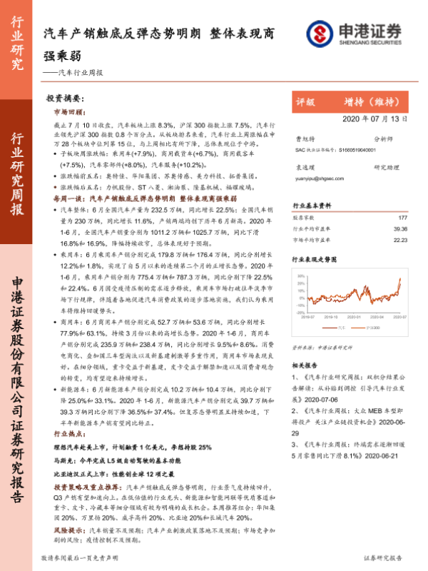 【申港证券】【20200713】20200713-申港证券-汽车行业周报:汽车产销触底反弹态势明朗 整体表现商强乘弱-16页