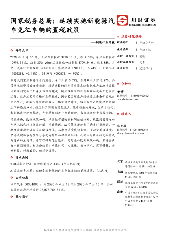 【川财证券】【20200716】制造行业日报:国家税务总局:延续实施新能源汽车免征车辆购置税政策-4页