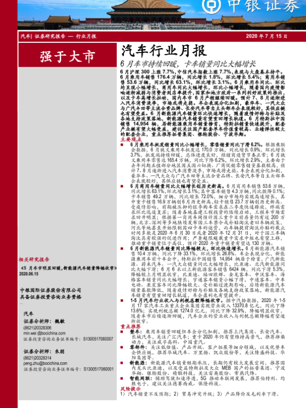 【中银证券】【20200715】20200715-中银证券-汽车行业月报:6月车市持续回暖,卡车销量同比大幅增长-16页