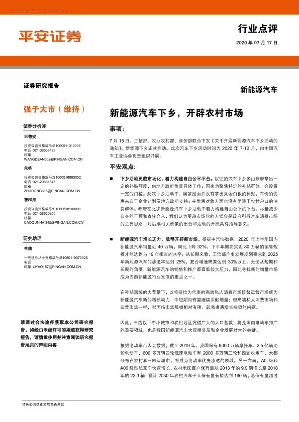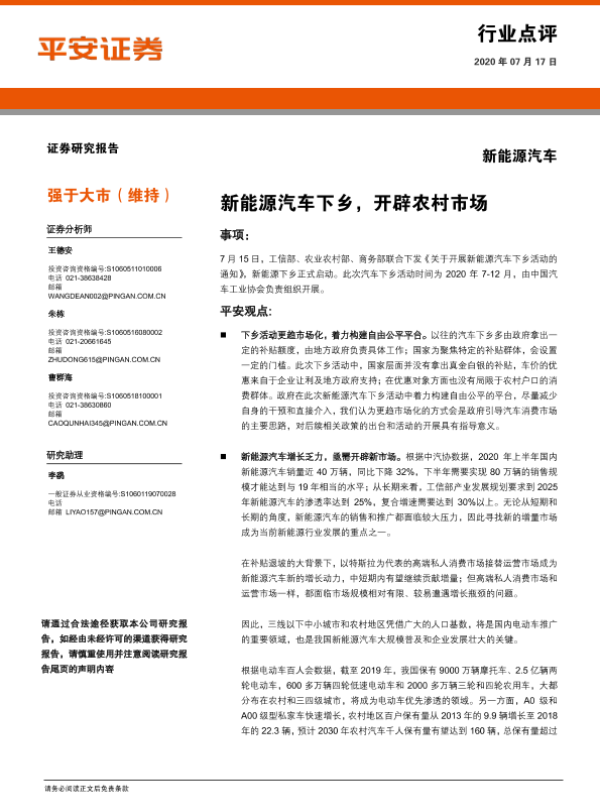 【平安证券】【20200717】新能源汽车:新能源汽车下乡,开辟农村市场-4页