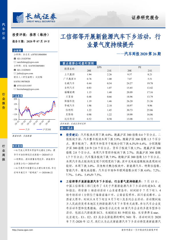 【长城证券】【20200719】汽车周报2020第26期:工信部等开展新能源汽车下乡活动,行业景气度持续提升-15页