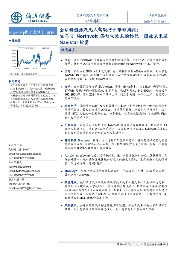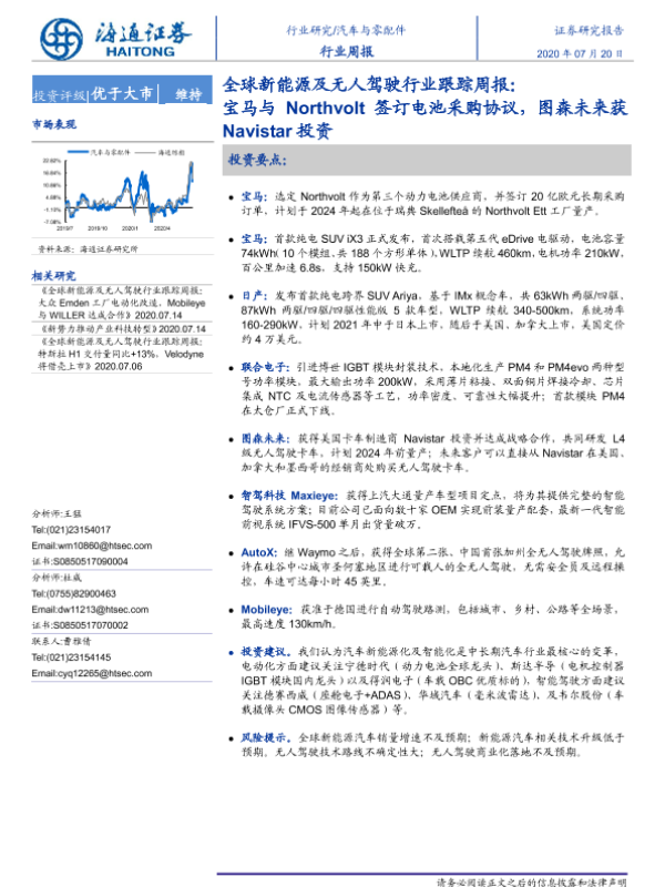 【海通证券】【20200720】全球新能源及无人驾驶行业跟踪周报:宝马与Northvolt签订电池采购协议,图森未来获Navistar投资-6页