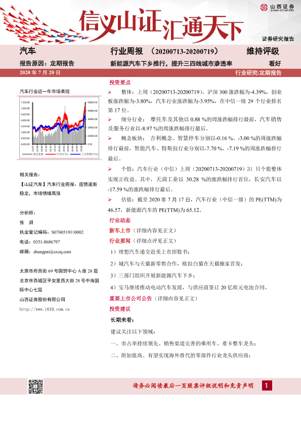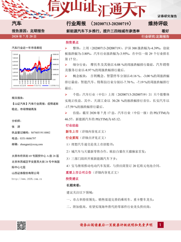 【山西证券】【20200720】20200720-山西证券-汽车行业周报:新能源汽车下乡推行,提升三四线城市渗透率-16页