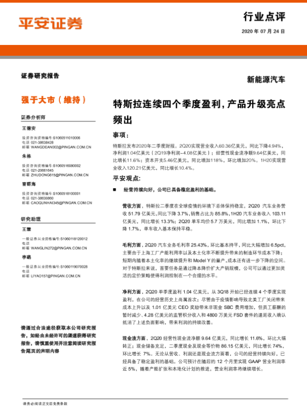 【平安证券】【20200724】新能源汽车:特斯拉连续四个季度盈利,产品升级亮点频出-5页