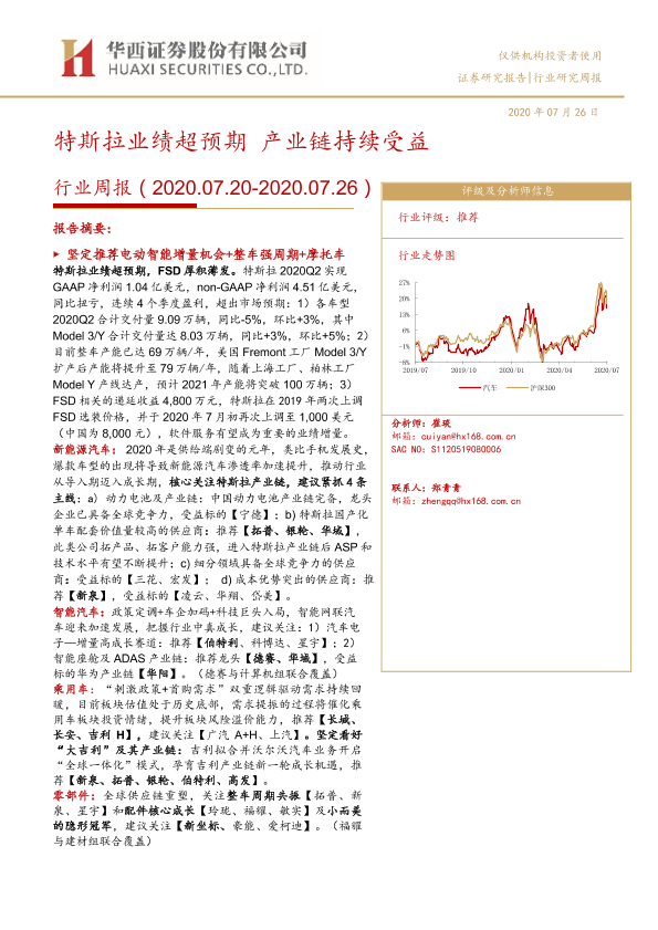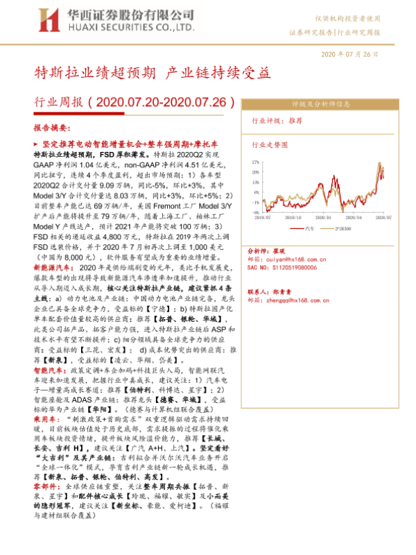 【华西证券】【20200726】汽车行业周报:特斯拉业绩超预期 产业链持续受益-18页