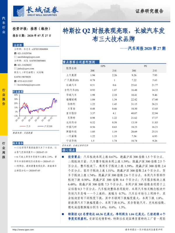 【长城证券】【20200727】汽车周报2020第27期:特斯拉Q2财报表现亮眼,长城汽车发布三大技术品牌-14页