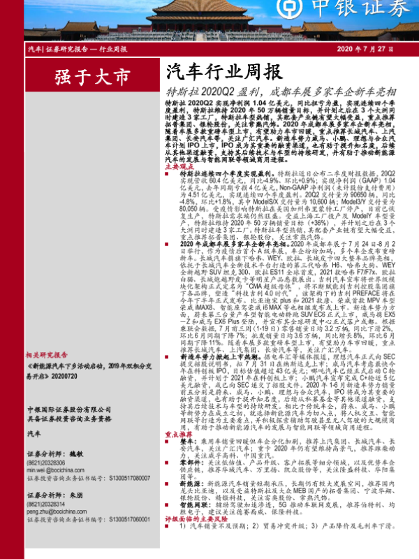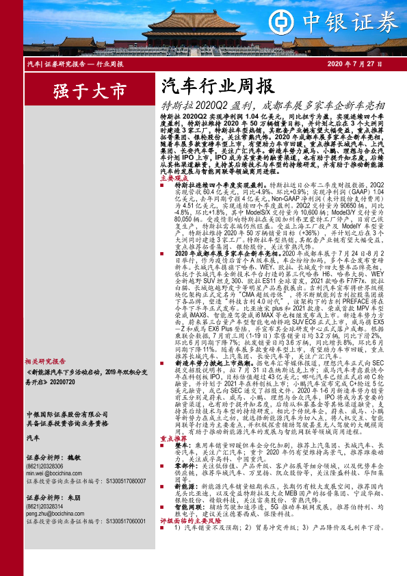 【中银证券】【20200727】汽车行业周报:特斯拉2020Q2盈利,成都车展多家车企新车亮相-15页