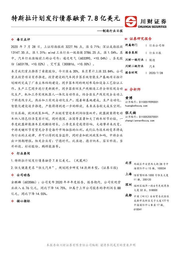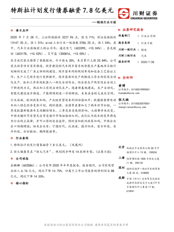 【川财证券】【20200728】制造行业日报:特斯拉计划发行债券融资7.8亿美元-4页